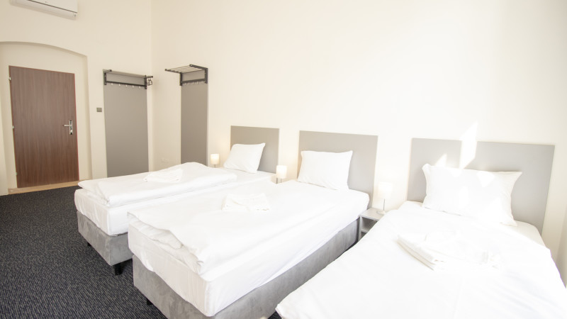 Das Achtbettzimmer mit externen privatem Badezimmer 2 wird modern und komfortabel ausgestattet, damit Sie sich nach der tageslangen Arbeit oder Spaziergang durch Prag ausruhen können und Energie für den nächsten Tag schöpfen.