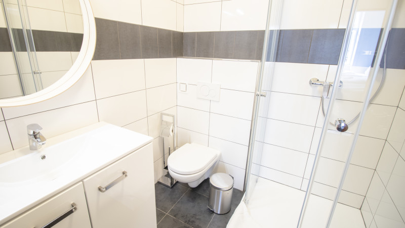 - Modernes Bad mit Duschecke, WC, Handtuchheizung, Haartrockner, Spiegel
